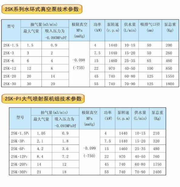 2SK系列適用于吸入壓力低于-0. 08MPa的工況條件。2SK P1系列適用于吸入低于-0. 096Mpa的工況條件,在配用大氣泵時(shí),極限真空度可達(dá)-750mmHg。工作真空范圍為-0. 03-0. 085MPa。